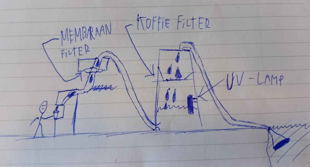 Voordat we echt begonnen met onderzoeken en contact opnemen met onze expert zeiden we dat iedereen 1 idee moest bedenken(dit hoeft niet perfect te zijn). Hier links kan je mijn idee vinden. Ik ging een beetje onderzoek doen en begon te tekenen. De bedoeling is dat de water van van bijvoorbeeld een riveir via een zuigbuis naar de koffie filter gaan en dan met de UV-lamp de ziektes van de water zit te verwijderen en dan met een andere zuigbuis naar de membraan filter die alle kleine deeltjes weghaalt. Uiteindelijk gaat het water naar een beker zodat iemand onze schoen water kan drinken.