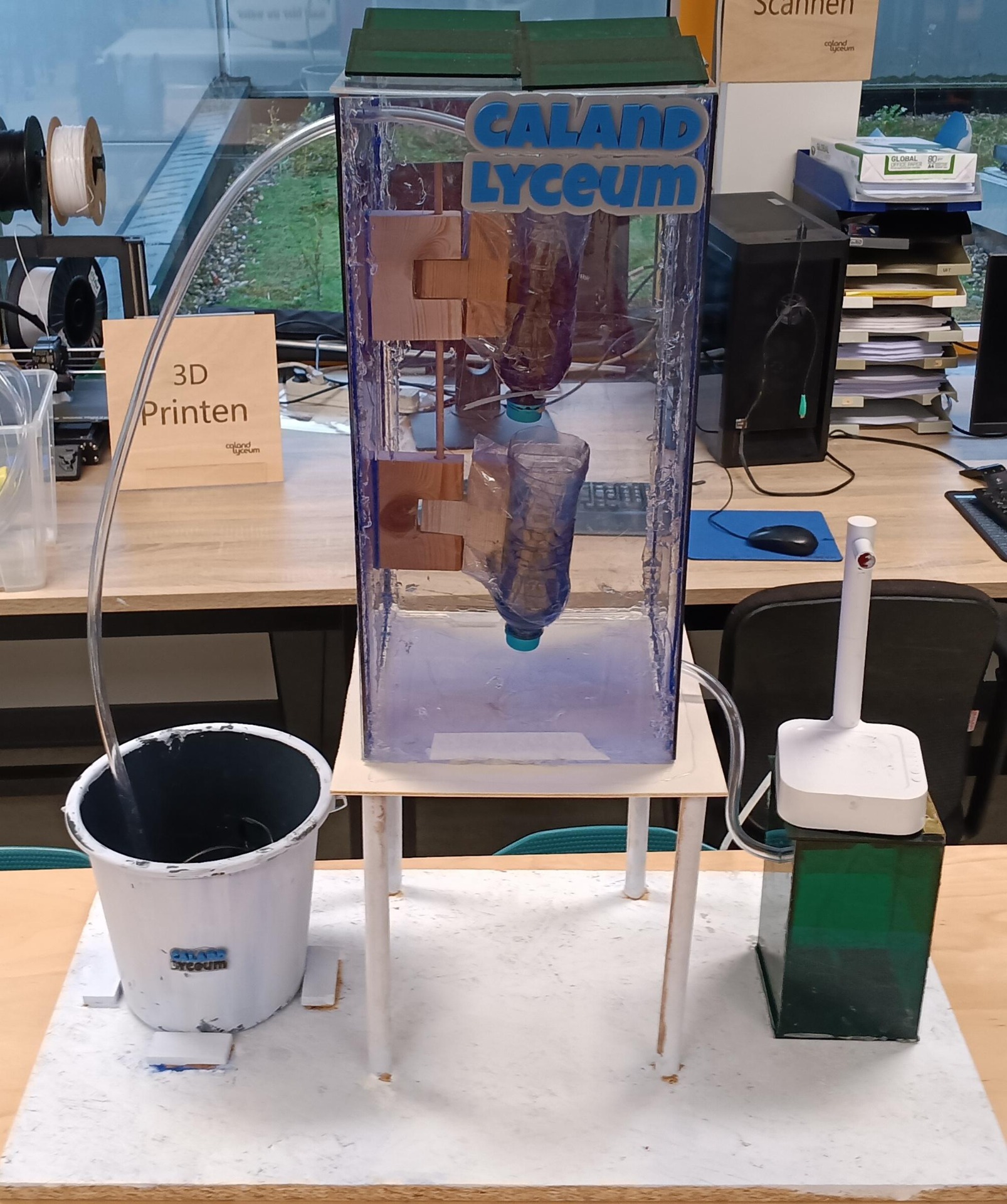In de linker foto kan je de eind prototype zien waar ik en mijn groepje er weken aan hebben gewerkt. In de emmer hoort vies water te zitten wat wordt gepomt naar de middelste bak. In de middelste bak zijn er 2 flessen met daaring filter stoffen. De filter stoffen zijn steentjes, zand, actieve koolstof, katoen en een koffiefilter. Dit kan j =e verwisselen als het niet emer werkt om de klep op de middelste bak te openen en de houte cilinder eruit te halen. Dan kan je de flessen weghalen en nieuwe erbij zetten met nieuwe filterstoffen. De water gaat dan in de groene bak waar een uv filter zit. De uv filter zorgt ervoor dat de water wordt gefilterd van bacterIĆ« en andere ziektes. Op de witte apparaat op de groene filter kan je een beker zetten en kiezen hoeveel ml water je in het beker wilt hebben. Deze hele apparaat heeft veel electrischiteit nodig voor de pomp en voor de water dispenser. We hebben dit opgelost om zonnepanelen te plaatsen op de middelste bak.